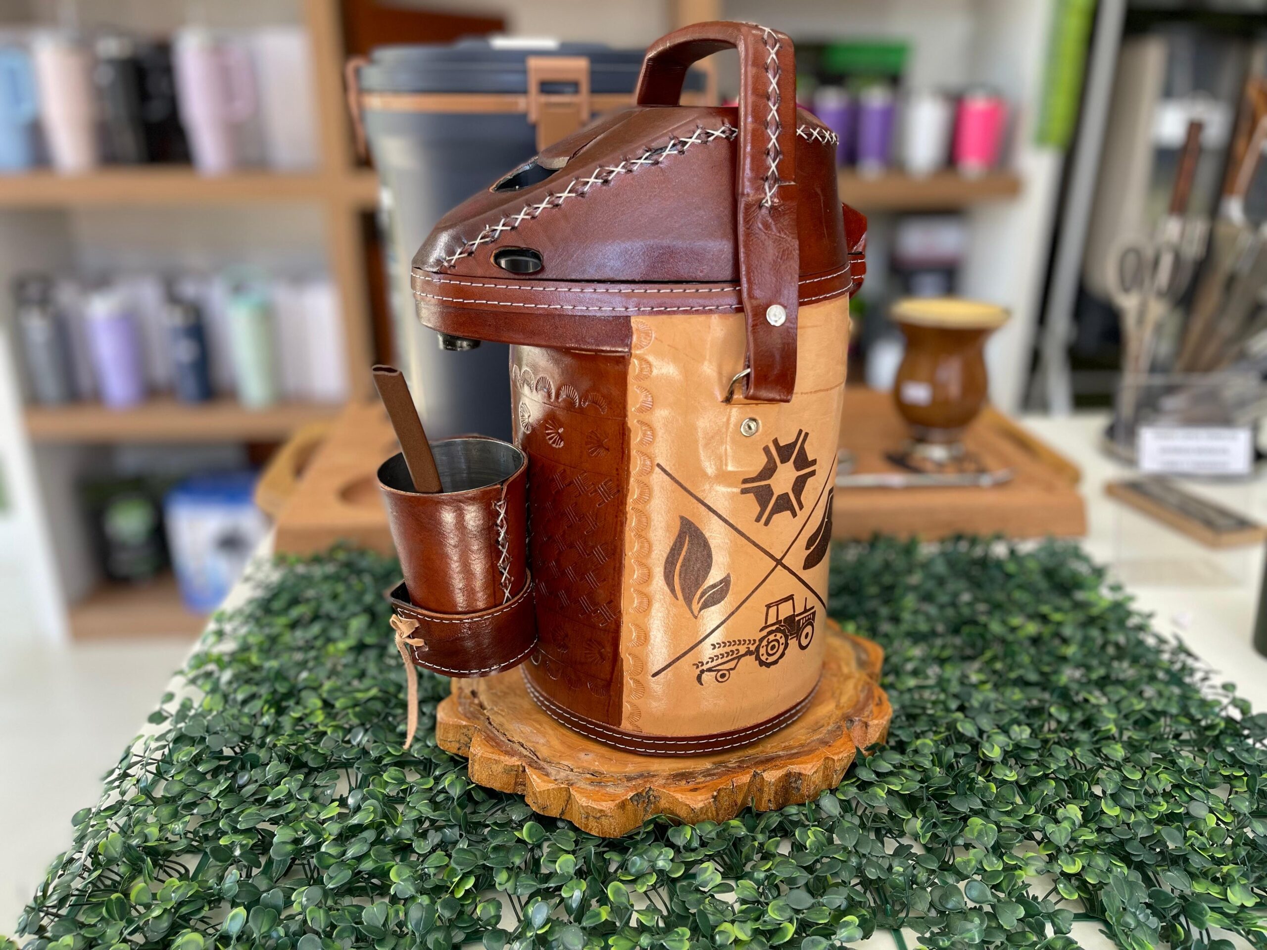 Praticidade, estilo e exclusividade para o seu Tereré! Nossa garrafa térmica de 4 litros revestida em couro de alta qualidade vem acompanhada de copo e bomba de Tereré, e pode ser personalizada com nome, frase ou logo à sua escolha.